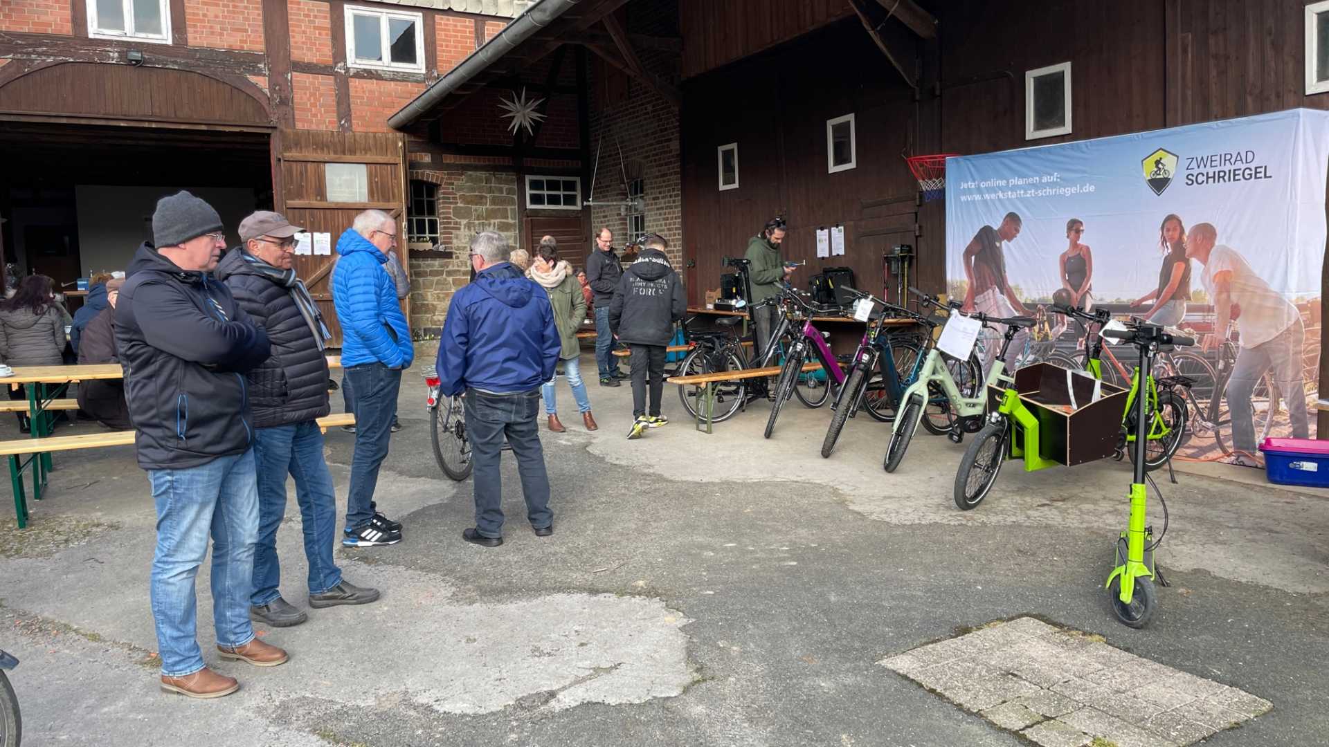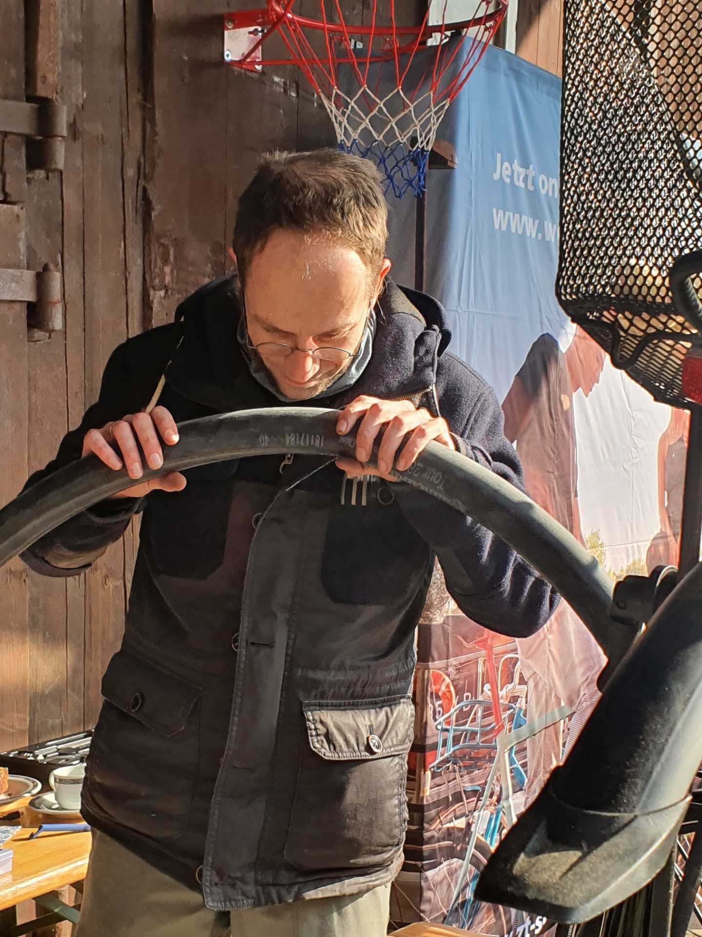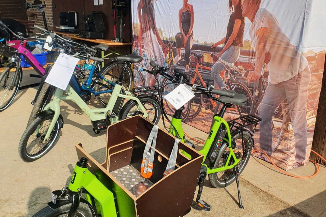 Nachdem ihr ganzes Equipment ausgeladen war, konnten Inspektionen an „klassischen“ und an E-Bikes durchgeführt werden. Fünfundzwanzig Fahrräder wurden in den zwei Stunden bei herrlichem Sonnenschein durchgecheckt. Die Besitzer waren angehalten, bei der möglicherweise fälligen Reparatur mit anzufassen, denn das Ganze war ja als Workshop aufgezogen worden. Da wurde dann mal die Schaltung richtig eingestellt, die Bremsen überprüft oder auch ein „Plattfuß“ behoben.