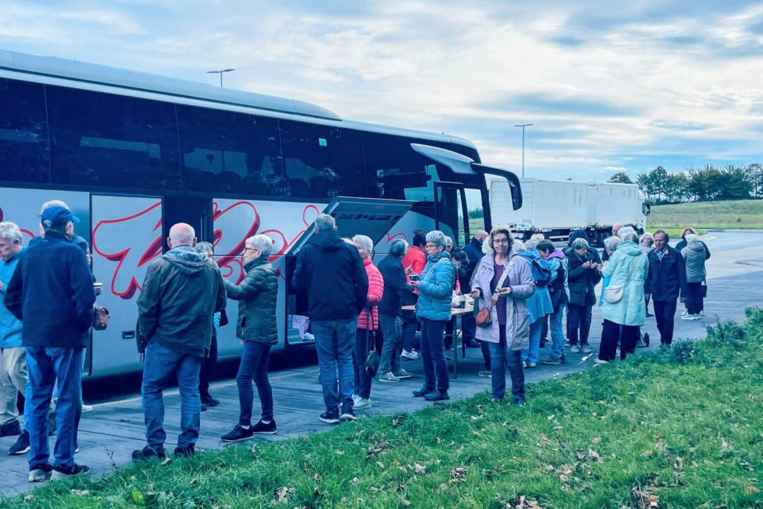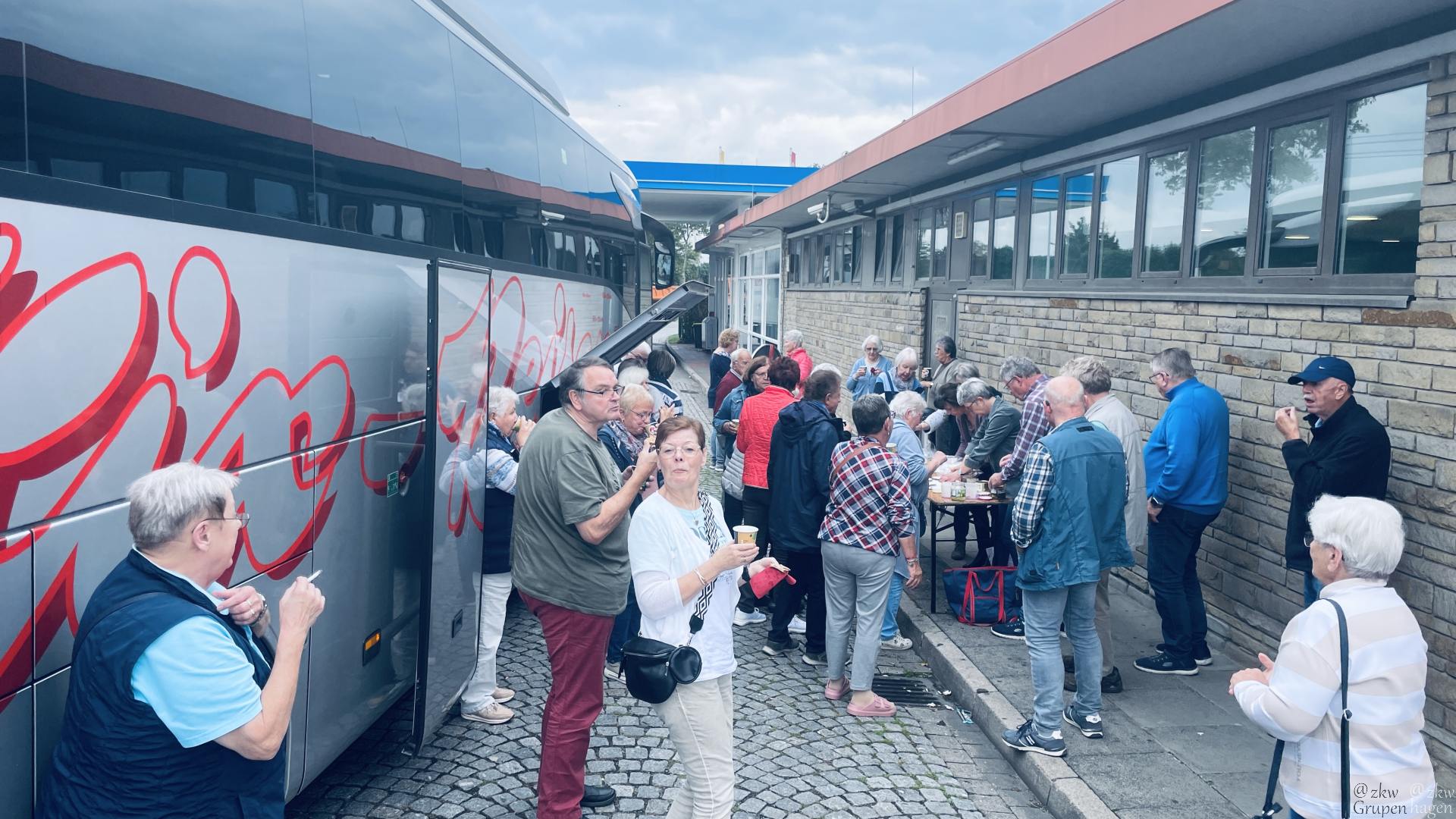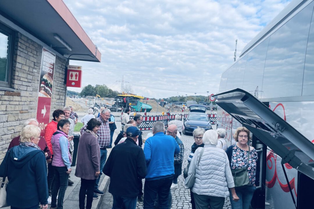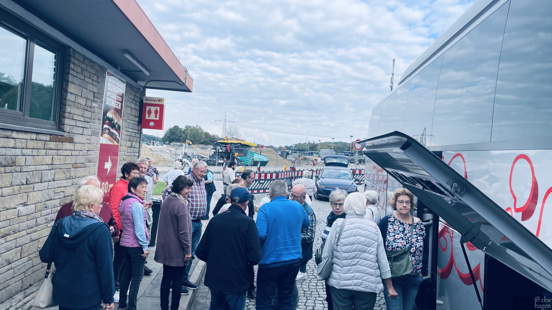 Den ersten Stopp haben wir um 09:30 Uhr in der Nähe von Werl an der A44 eingelegt. Die erste Vorsitzende des DRK-OV, Veronika Bleibohm, hat wieder prima vorgesorgt und für ein Frühstücksangebot gesorgt. Mit weiteren Helfern und Helferinnen wurden Brote geschmiert und Gürkchen gereicht.