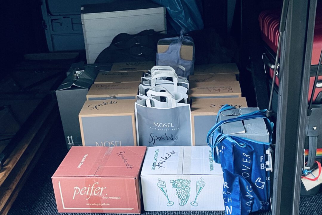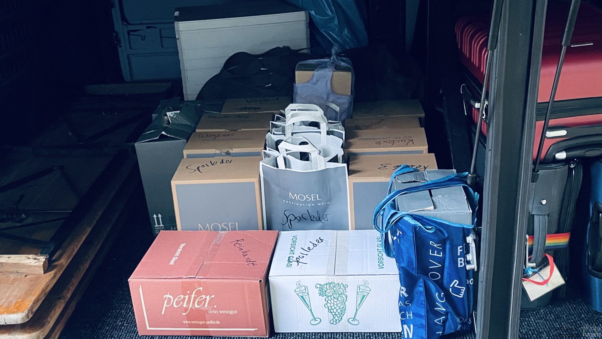 Ein Teil des Gepäckfachs ist für merkwürdige Kartons reserviert. Man könnte meinen, einige Rebsorten fanden ihre Abnehmer.